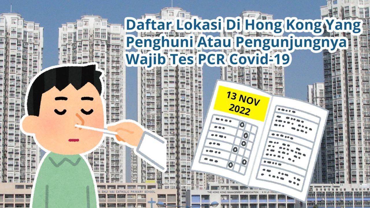 Pusat Perlindungan Kesehatan Hong Kong (Centre for Health Protection) pada tanggal 13 November 2022 mengumumkan daftar lokasi wajib tes PCR untuk tanggal 13 November 2022 bahwa setiap orang yang berada di lokasi-lokasi berikutnya pada tanggal dan jangka waktu yang tertulis dalam daftar wajib mengikuti tes Covid-19 sebelum tanggal yang telah ditentukan.