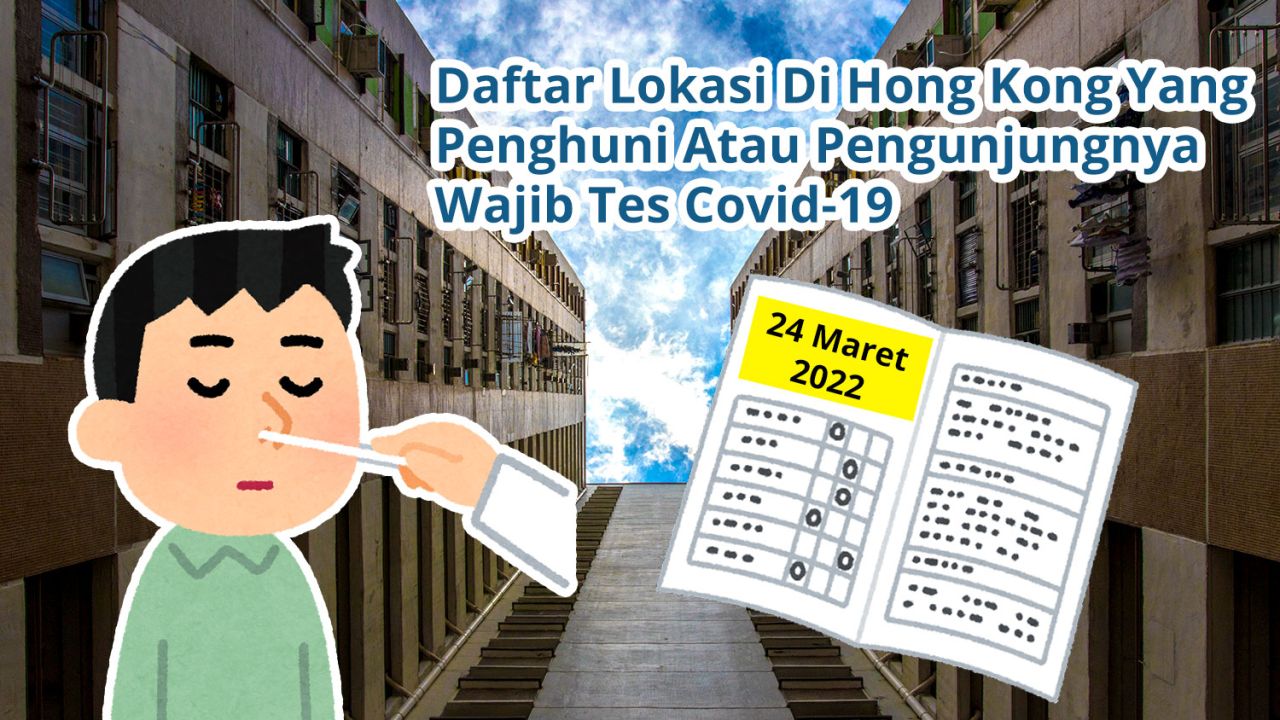 Pusat Perlindungan Kesehatan Hong Kong (Centre for Health Protection) pada tanggal 25 Maret 2022 mengumumkan daftar lokasi wajib tes tanggal 24 Maret 2022 bahwa setiap orang yang berada di lokasi-lokasi berikutnya pada tanggal dan jangka waktu yang tertulis dalam daftar wajib mengikuti tes Covid-19 sebelum tanggal yang telah ditentukan.