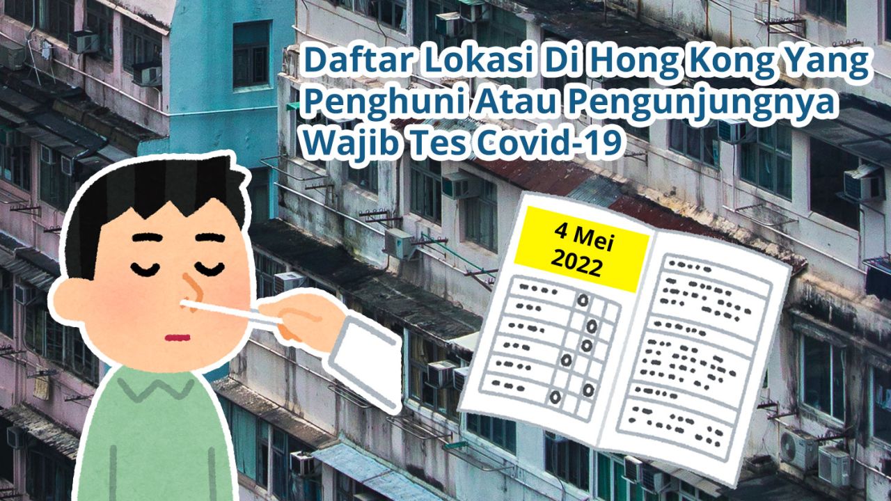 Pusat Perlindungan Kesehatan Hong Kong (Centre for Health Protection) pada tanggal 5 Mei 2022 mengumumkan daftar lokasi wajib tes tanggal 4 Mei 2022 bahwa setiap orang yang berada di lokasi-lokasi berikutnya pada tanggal dan jangka waktu yang tertulis dalam daftar wajib mengikuti tes Covid-19 sebelum tanggal yang telah ditentukan.