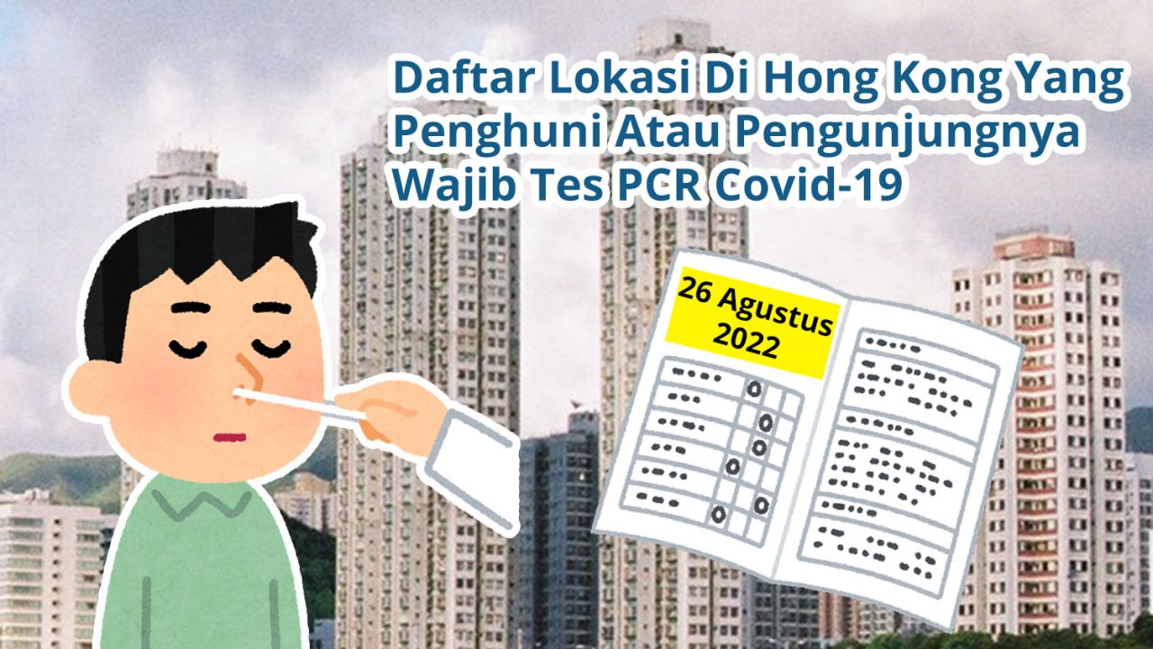 Pusat Perlindungan Kesehatan Hong Kong (Centre for Health Protection) pada tanggal 26 Agustus 2022 mengumumkan daftar lokasi wajib tes PCR tanggal 26 Agustus 2022 bahwa setiap orang yang berada di lokasi-lokasi berikutnya pada tanggal dan jangka waktu yang tertulis dalam daftar wajib mengikuti tes Covid-19 sebelum tanggal yang telah ditentukan.